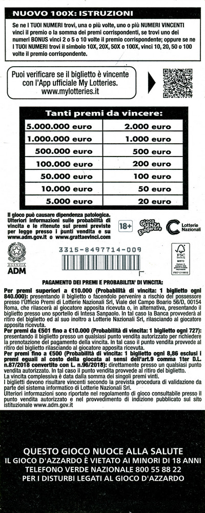 | 2018 | BIGLIETTI GRATTA E VINCI: NUOVO 100X |
