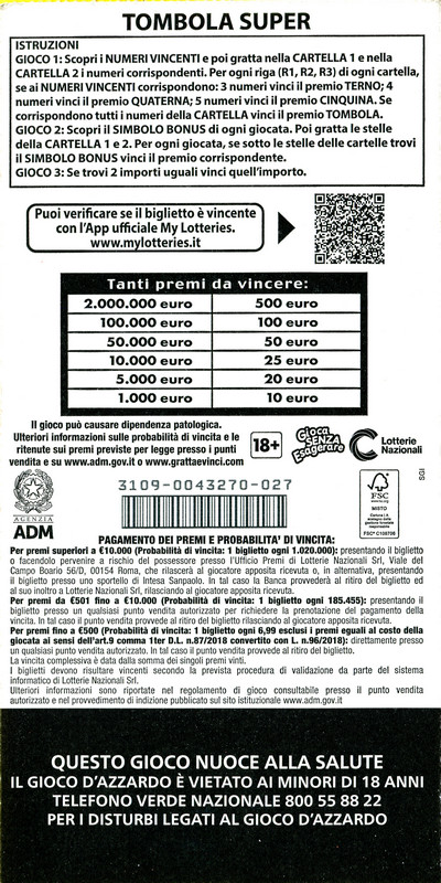 probabilità di vincita: un biglietto ogni 6,99 |